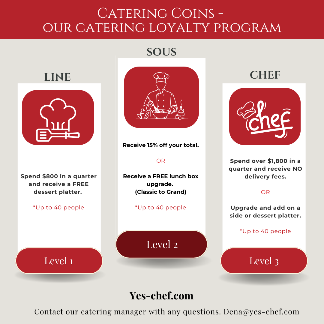 We offer drop off / food delivery catering and specialize in corporate events Monday-Friday 7:00am-6:00pm drop off/set up. Yes Chef! offers a variety of café box breakfast and lunch choices, platters and bowls or a hot breakfast, lunch or dinner buffet. Contact us at dena@yes-chef.com or jodi@yes-chef.com or call us at 877-937-2433.