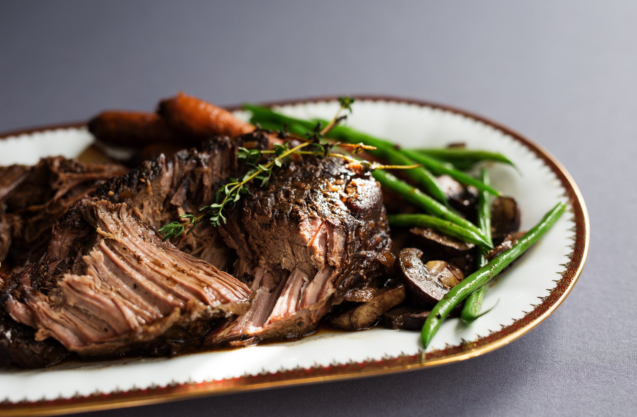 Slow roasted for over 12 hours in red wine and herbs for flavor and tenderness. With seasoned pan au jus and served with our smashed Idaho potatoes and your choice of vegetable.